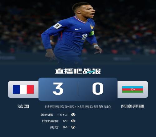 世预赛欧洲区小组赛D组第3轮,法国3-0轻取阿塞拜疆,姆巴佩传射、拉比奥特、托万进球。