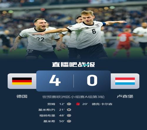 世预赛欧洲区小组赛A组第3轮,德国4-0大胜卢森堡,基米希梅开二度,劳姆世界波,格纳布里进球。