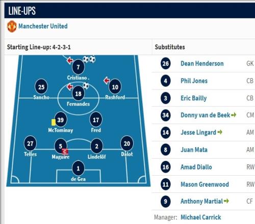 替补席则是:迪恩·亨德森、菲尔·琼斯、拜利、范德贝克、林加德、马塔、阿玛德、格林伍德、马夏尔。
