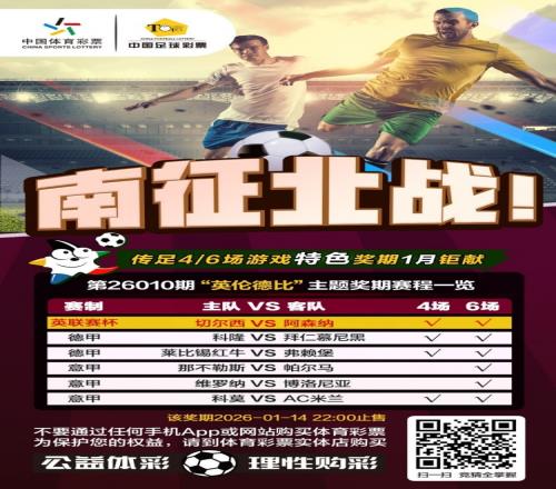 第26010期传足4/6场游戏特色奖期已经于2026年1月11日20:00开售,将于2026年1月14日22:00停售,并于2026年1月16日开奖,其中切尔西VS阿森纳、科隆VS拜仁慕尼黑、莱比锡红牛VS弗赖堡、科莫VSAC米兰为4场进球游戏竞猜赛事。